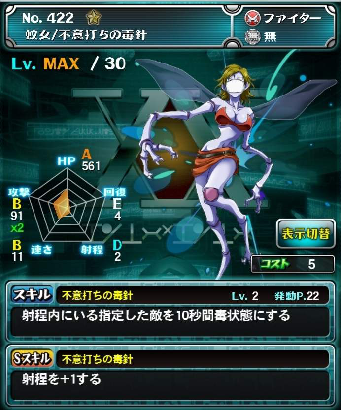 说明 | 射程内にいる指定した敌を10秒间毒状态にする | ||||||||