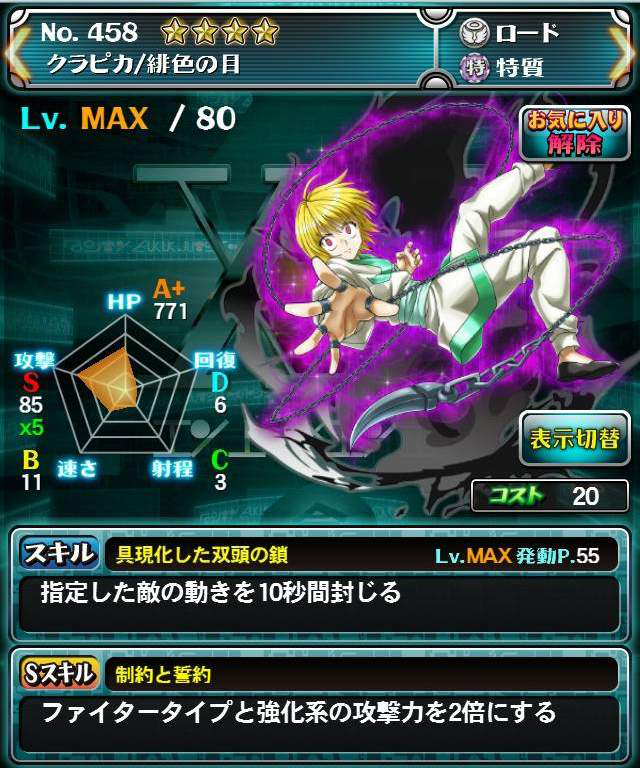 ![]() | 名称 | クラピカ/绯色の目 | 类型 | 未归类猎人 | |||||