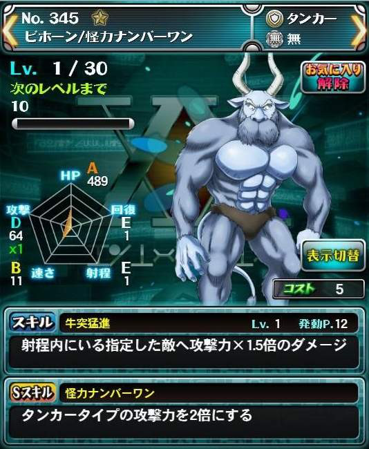 说明 | 射程内にいる指定した敌へ攻撃力×1.5倍のダメージ | ||||||||