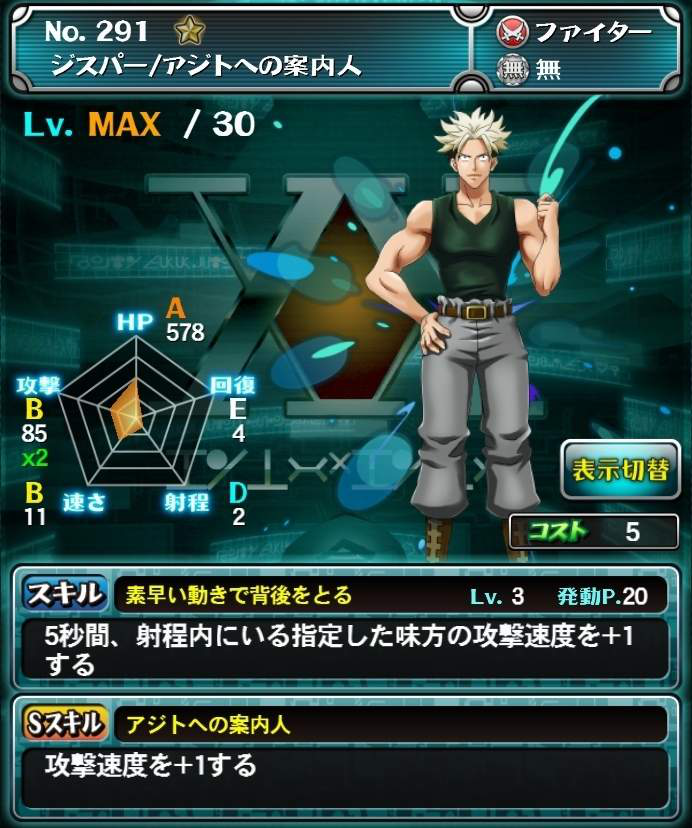 说明 | 5秒间、指定した味方の攻撃速度を 1する | ||||||||