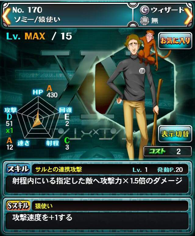 说明 | 射程内にいる指定した敌へ攻撃力×1.5倍のダメージ | ||||||||